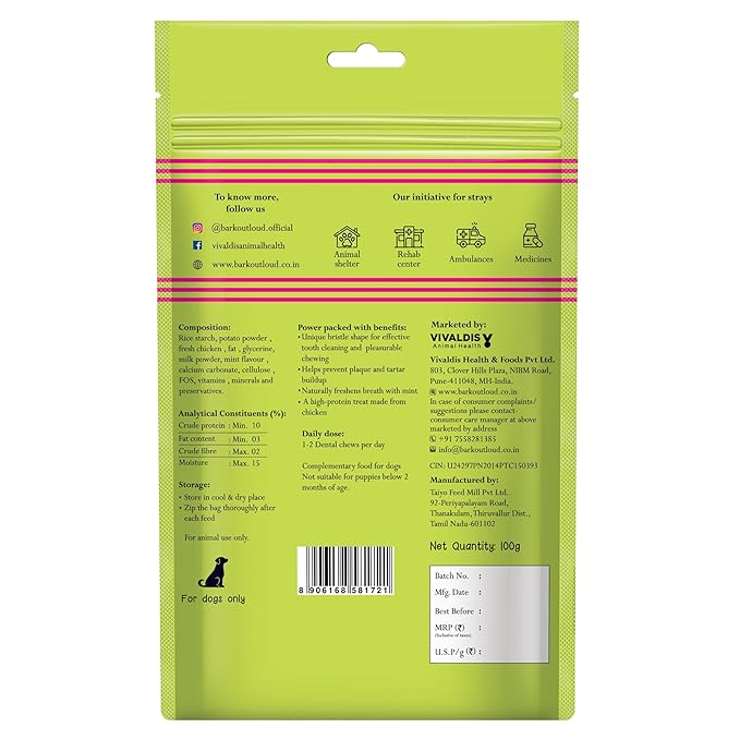 BARK OUT LOUD - Dental Treats | Brush Shape Dog Chews | Removes Plaque/Tartar | Fresh Smell | Oral Care Gluten Free| Chicken Dog Treats (100 GMS)