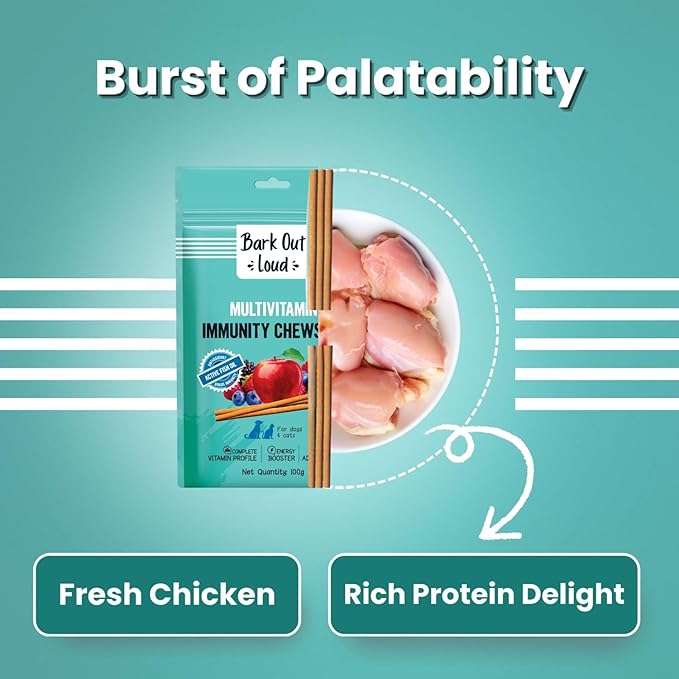 BARK OUT LOUD - Multivitamin Dog Treats, Fresh Chicken Immunity Chewstix with Omega & Zinc to Boost Health & Vitality for Dogs & Cats of All Life Stages - 100g (Pack of 1)