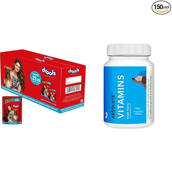 Drools Adult Wet Dog Food, Real Chicken and Chicken Liver Chunks in Gravy, 15 Pouches (15 x 150g) & Absolute Vitamin Tablet- Dog Supplement, 50 Pieces