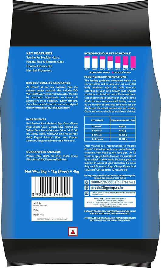 Drools Kitten(1-12 months) Dry Cat Food, Ocean Fish - 4kg (3kg + 1kg Free Food Inside)