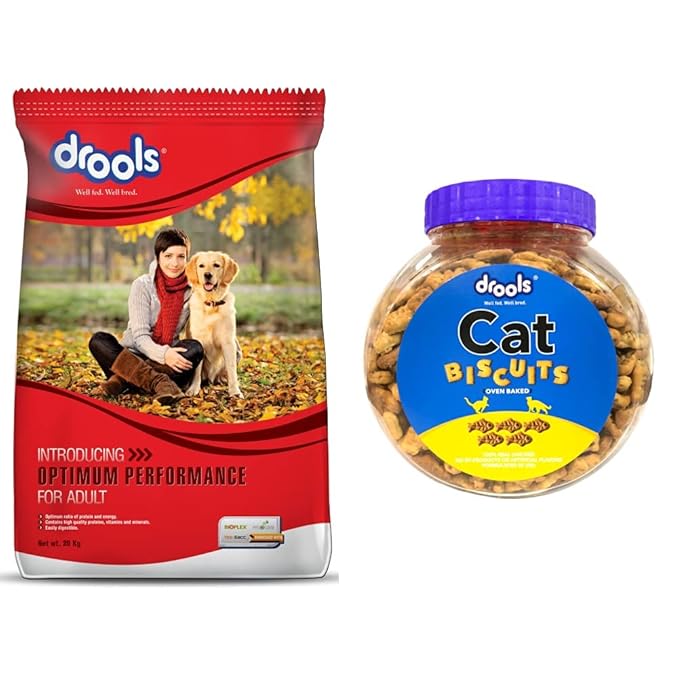 Drools Optimum Performance Adult Dry Dog Food, 20kg&Drools Real Chicken Biscuits, Cat Treats Jar - 400g