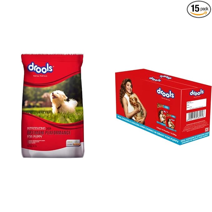 Drools Optimum Performance Puppy Dry Dog Food, Chicken Flavor, 20kg&Drools Puppy Wet Dog Food, Real Chicken and Chicken Liver Chunks in Gravy, 15 Pouches (15 x 150g)
