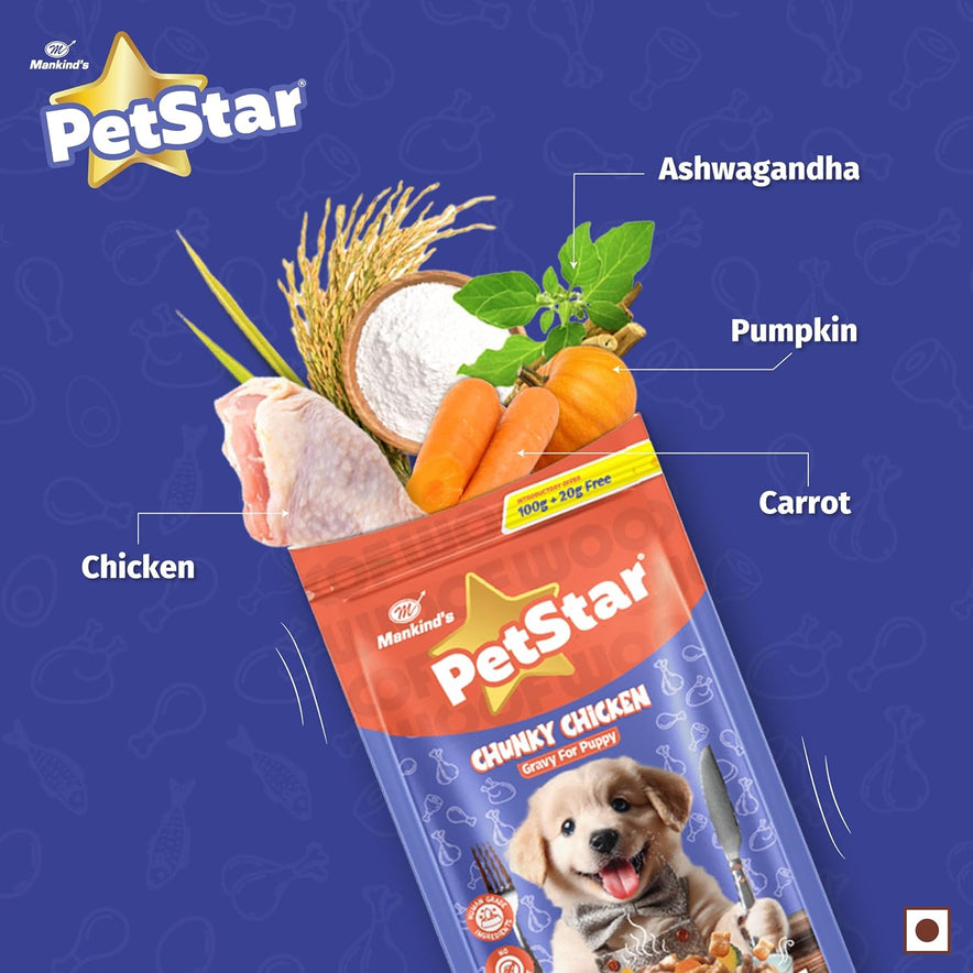 Mankind Petstar Puppy Wet Dog Food (High Protein) Chunky Chicken Gravy, 120g (Pack of 15) | Made with Real Chicken & Veggies |No Artificial Flavors