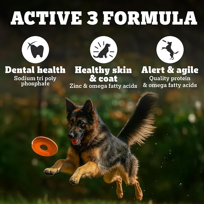 Active 3 Performance Formula: A specialized blend featuring quality proteins and Omega fatty acids for mental alertness and agility, STTP to reduce plaque buildup, and Zinc to nourish skin and coat health.