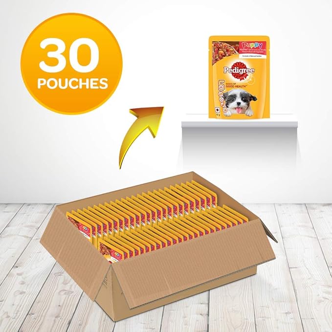 Pedigree Puppy Wet Dog Food, Chicken and Liver Chunks Flavour in Gravy with Vegetables, 30 Pouches (30x70g) & Pedigree Adult Dog Treat Sticks Meat Jerky Stix, Barbeque Chicken, 80 g Pouch
