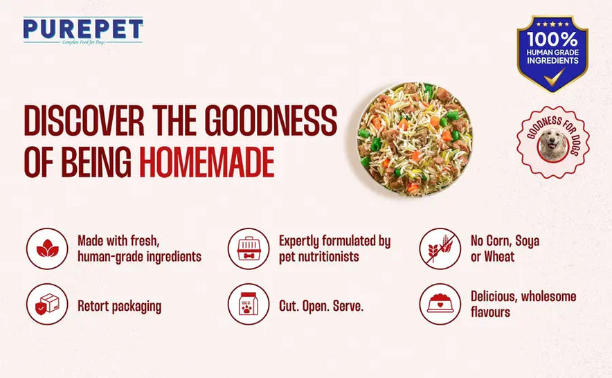 Treat your dog to the warmth and nourishment of a home-cooked meal with this ready-to-eat Mutton Recipe Wet Dog Food. Crafted using fresh, human-grade ingredients and developed by skilled pet nutritionists, this meal is designed to keep your dog healthy and active from puppyhood to seniority.