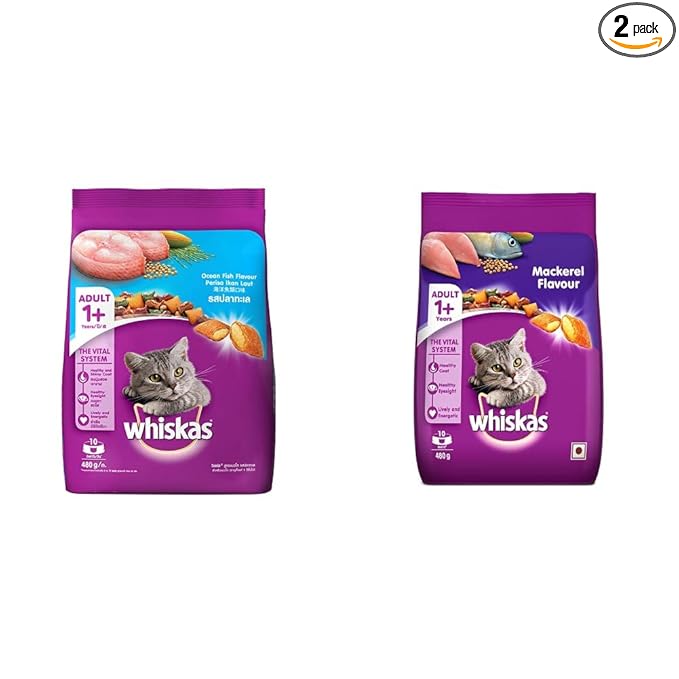 Whiskas Adult (+1 Year) Dry Cat Food, Ocean Fish Flavour, 480g Pack & Adult (+1 Year) Dry Cat Food, Mackerel Flavour, 480g Pack
